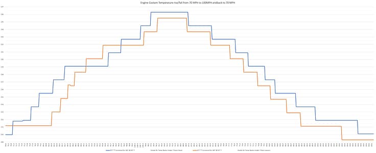 It was now time to test the louvers but we found that highway driving didn't cause the engine temps to climb much beyond thermostat open unless we pushed the Jeep pretty hard. For that reason, we produced the conditions required to see if there was any measurable change. The subsequent tests involved a steady state cruise at 70mph in 8th gear (Remember, we have an 8-speed auto swapped in), and then dropping rapidly to 5th and holding 100% throttle to 100 MPH, shifting back to 8th, and letting the Jeep return to 70 MPH cruise. We did this with the unmodified hood to document temperature rise and fall (Blue line), and then repeated the test with the louver in (Orange line) over the same stretch of road, wind conditions, and temperature (0.4°-0.9°warmer on 2nd run).