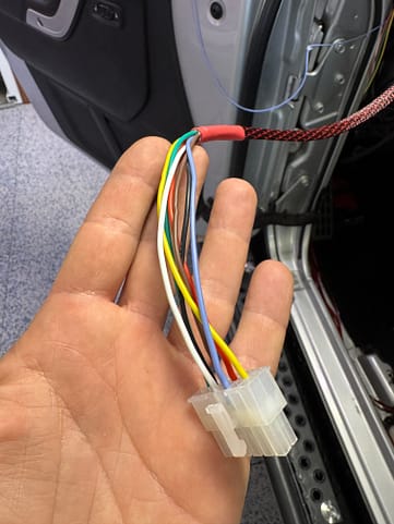 The white wire comes from the high beam circuit and hits 4 switches to allow any of them to be triggered by the high beams as desired. The blue wire is from the backup light circuit. All the other colors are all heading down to the BantamX aux inputs to trigger the desired circuits. Connections to the switch leads were made using these non-insulated butt crimps and this heat shrink. Here are some pictures of the wiring assembled: