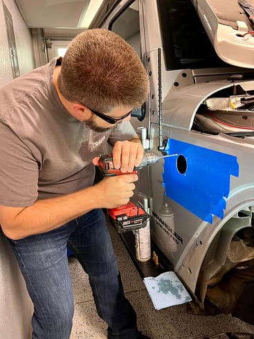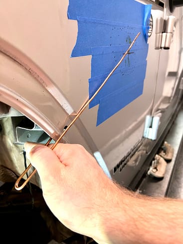 For any of you looking to do this yourself, It can likely be done with the inner fenders still installed by simply measuring out the location of this hole. As shown above, it is 9-7/8" ahead of the driver door gap and 4-1/4" below the seam between fender and cowl. With the location determined, we center-punched the spot and used our best hole-cutters in 2-1/2" diameter to do the job because regular hole-saws make a mess of thin sheet metal.
