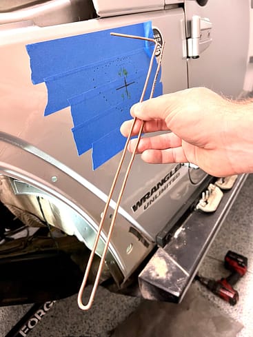As a result, we now have a super clean hole that needs no further work. We then used a digital angle finder to set the Baja Designs S1 light in the hole parallel with the fender seam above, and marked for the 4 screws.
