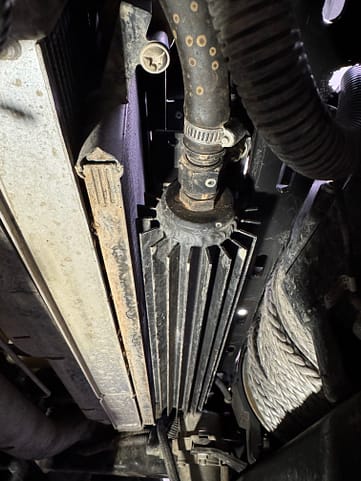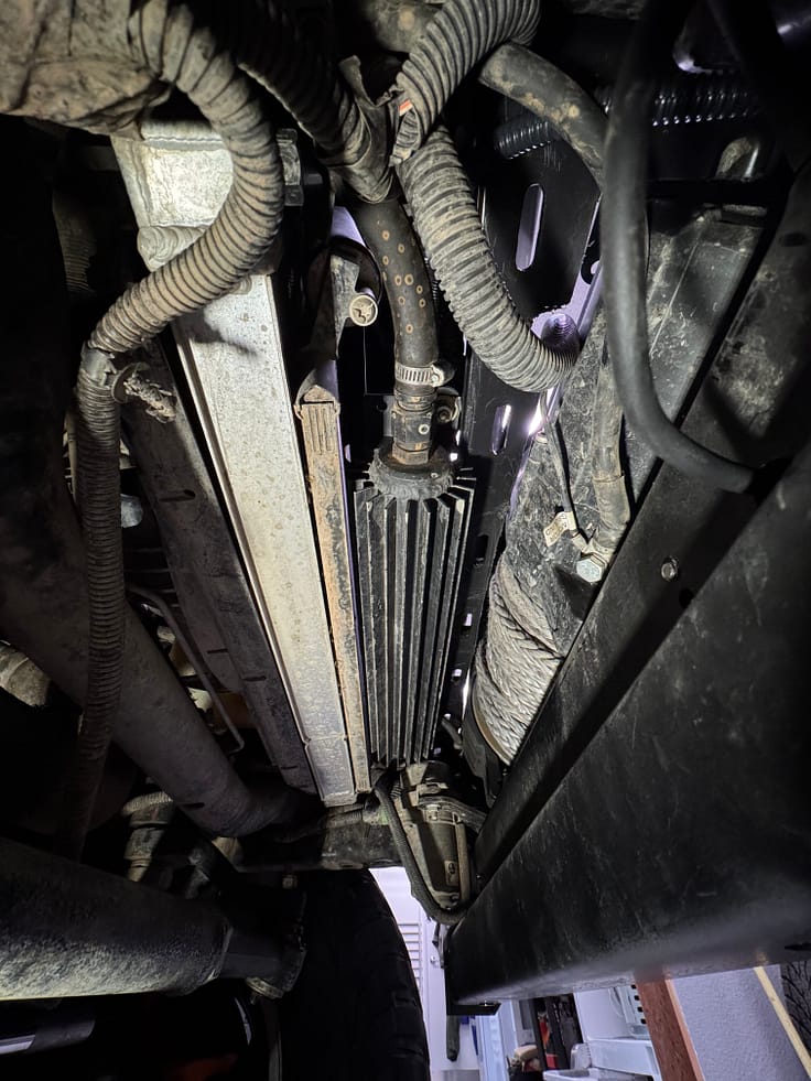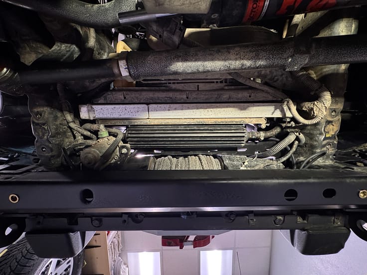 The PSC cooler is now about even with the bottom of the radiator, and forms a fairly close fitting baffle from radiator to winch. In the photos below you can see the new mounted position: