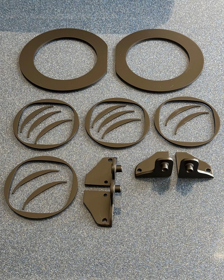 To secure the lights, we designed a few aluminum rings that fit behind the face plate and around the body of each light closely. These rings slide tightly into the stock blinker holes, allowing the whole assembly to center perfectly. In order to offer adjustment for these rather directional spot pattern lights, we cut some banana-shaped shims to offer any adjustment needed in roughly 1° increments. Some larger aluminum rings distribute the clamping load across the back of the grill, and a set of aluminum angle brackets with screws offer the necessary clamping pressure to hold the entire assembly together. Here are all the parts we made: